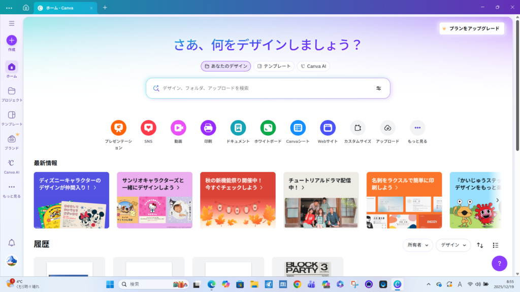 Canvaは 誰でも直感的にプロ級デザインを作れるオンラインのビジュアル制作ツール です。ポスターやチラシから動画、SNS画像、名刺、プレゼン資料まで幅広く作れます。初心者でも扱いやすく、シニアICTクラブの教材づくりにも非常に相性が良いサービスです。